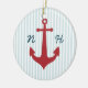 Ornamento da lembrança que coordena com minha série náutica do casamento. Âncora vermelha em um fundo listrado azul e branco.