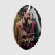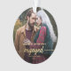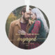 Um presente de Natal memorável para os recém-noivos. Envie esta bela Enfeites de natal fotográfica para o recém-engajado casal para comemorar seu primeiro Natal como um casal noivo. O ornamento apresenta "engajado" em uma bela fonte de ouro falso, escrita à mão, com espaço para duas fotos diferentes, uma na frente e a outra no verso. Personalize o ornamento substituindo as fotos, os nomes e o ano.
