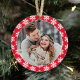 Este enfeite moderno de lembrança de Natal apresenta uma foto do casal recém-casado na frente emoldurada por uma cor vermelha com um padrão contrastante de flocos de neve brancos de inverno. A parte traseira do design inclui o mesmo esquema de cores com a frase "Nosso Primeiro Natal" e um monograma personalizado com os nomes deles e o ano em que se casaram.