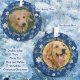 Um ornamento fotográfico de dois lados estava em azul com flocos de neve brancos e nítidos mostra uma ou duas fotos do seu melhor amigo. Eu sugiro uma imagem de Puppy ou Kitten e uma imagem do animal de estimação adulto. Adicione o nome do animal de estimação e outros sentimentos em quatro modelos. O lado oposto é, opcionalmente, uma foto diferente do seu animal de estimação e mais quatro modelos em uma fonte de script espessa e bonito. Um tesouro para as suas férias vir ou um presente querido para o amante de animais de estimação na sua vida.