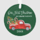 Escrita de Pincel Moderna Nosso Primeiro Natal como Ornamento de Avós inclui Watercolor Vintage Red Truck com Árvore de Natal, Neve, Presentes de Natal e Canes Doces. Fundo Verde Florestal.