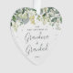 Morangos pintados à mão e caules de eucalipto formam uma fronteira através do topo deste ornamento em forma de coração. Todo o texto é totalmente editável para que você possa mudar facilmente o texto e mudar o estilo/cor/tamanho/posicionamento da fonte. Substitua a foto de modelo no verso por sua.
