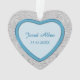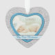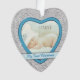 Este ornamento de guardas de férias apresenta sua própria fotografia do bebê enquadrada em um bonito quadro azul de coração alinhado em prata. O quadro cardíaco está bordado com um padrão circular floral de cinza prateada. Um banner azul claro mantém seu texto personalizado; faça-o dizer o que você quiser! A parte de trás do ornamento tem a mesma borda de espiral prateada e o mesmo quadro em forma de coração com texto adicional no dentro azul-claro. Isso faz um belo presente de manutenção para novos pais.
