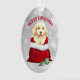 Um adorável pop de filhote de Retriever Ouro de um saco de presente vermelho na frente deste Enfeites de natal. Algumas bolbos de árvore de Natal, com padrão de ouro e lacrimejo, estão bem na frente do saco de Papais noeis. O texto acima da imagem diz "MERRY CHRISTMAS" em vermelho. A imagem e o texto são colocados sobre um fundo prateado de abstrato. A parte de trás do ornamento tem a mesma imagem, mas com o texto "FELIZ ANO NOVO" em verde-real.