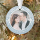 O ornamento festivo de fotos de Natal apresenta uma foto favorita em cada lado, cercada por um padrão de blusa de festas em azul pálido e branco. Personalize com sua legenda personalizada; mostrada com "casado e feliz" de um lado e seus nomes no contrário. Perfeito para mostrar fotos de casamento no seu primeiro Natal casado!
