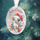 Neste adorável ornamento de Natal, um pequeno e adorável cão Chihuahua esteve nas decorações de Natal! Ele está embrulhado em luzes, e os ornamentos estão nos seus pés. O cachorro veste um chapéu de Papai Noel vermelho e branco. O texto acima da imagem diz "MERRY CHRISTMAS" em vermelho. A imagem e o texto são colocados sobre um fundo prateado de abstrato. A parte de trás do ornamento tem a mesma imagem, mas com o texto "FELIZ ANO NOVO" em verde.