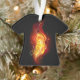 Pena de pavão brilhante feita de fogo e chamas sobre fundo negro.