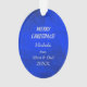 Este Enfeites de natal apresenta uma silhueta prateada de gelo fêmea em frente a um spray de flocos de neve prateada. A imagem é colocada sobre um fundo azul brilhante de abstrato. A parte traseira do ornamento tem o mesmo plano de fundo azul com campos de texto que você pode personalizar. Perfeito para o patinador de gelo ou fã de patinagem de gelo, e também faz um excelente de guarda de crianças de pais ou avós.