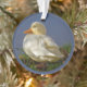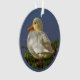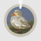 Um pequeno pato branco giro está sentado na orla costeira, pronto para dormir.