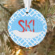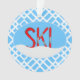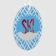 O texto de esqui feito de esquis vermelhos e uma deriva de neve em um oval é um divertido design de presente de esqui de neve no inverno para descida, ponta gêmea e esquiadores de campo cruzado com data personalizável.