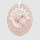 Moderno personalizado O primeiro Natal, que apresenta uma bela coroa branca e textura falsa de ouro rosa de cobre. Personalize o produto com o nome, o ano e duas de suas fotos favoritas.