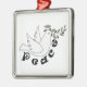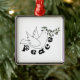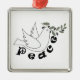 Um ornamento personalizado da paz que inclui uma pomba com um ramo de oliveira e a palavra Paz ao longo do peito da pomba, com o sinal de paz dos 60 anos.