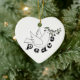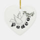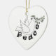 Um ornamento personalizado da paz que inclui uma pomba com um ramo de oliveira e a palavra Paz ao longo do peito da pomba, com o sinal de paz dos 60 anos.