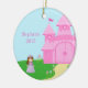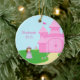 Este ornamento cerâmico dado forma círculo tem um tema doce da princesa. Há uma princesa pequena bonito com o cabelo marrom que está à esquerda de seu castelo do rosa quente que está à direita. Na terra, há uns lotes de flores azuis e cor-de-rosa. Na esquerda, você pode personalizar o nome e o ano.