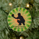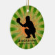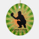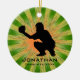 Baseball Catcher Ornament Personalizado Natal 20XX. Um apanhador em posição contra um fundo verde e laranja de explosão. Todo texto personalizável, frente e verso!