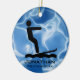 Ornamento personalizado de esqui d'água Natal 20xx em um fundo de água ondulada azul, com texto personalizável.