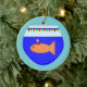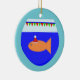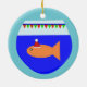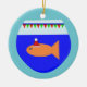 Este ornamento apresenta um peixe dourado laranja de Natal divertido vestindo um chapéu festivo de santa. O peixe dourado está nadando na água azul da sua tigela de peixe dourado. O peixe decorou o topo da tigela com bandeiras vermelhas e verdes que soltam a mensagem "pesca de Feliz". Este peixe sazonal divertido está pronto para uma grande festa de Natal.