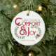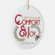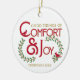 Esse ornamento festivo pode ser personalizado com o ano atual na frente, e com seu nome ou texto no verso. A design apresenta a tipografia de vintage e ilustrações de ramos sagrados com bagas e dois cardeais vermelhos na frente. O texto vermelho e dourado diz "Boas Formas de Conforto e Alegria". O texto vermelho e as folhas verdes ocas são esboçados com uma cor dourada. Na parte de trás, uma versão maior de um cardeal vermelho fica em um galho sagrado.