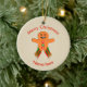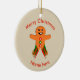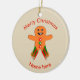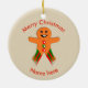 Este ornamento apresenta um desenho fofo de um homem colorido de pão de gengibre. Ele tem botões vermelhos e verdes, um sorriso grande em seu rosto e bruxas vermelhas e verdes em volta de suas pernas prontas para uma festa de Natal.