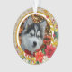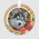 The front of the ornament features a cherished photograph of your pet (e.g., "Rocky," a husky puppy with a red bow).