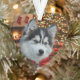 The front of the ornament features a cherished photograph of your pet (e.g., "Rocky," a husky puppy with a red bow).