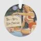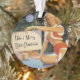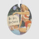 Enfeites de natal com a ilustração vintage da década de 1950 de uma bonito pinup girl em um conjunto de papais noeis segurando uma placa. Personalize as costas com seu próprio sentimento. Legal!