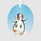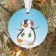Uma bela ilustração de inverno que apresenta um pinguim desajeitado de bom humor vestindo luvas e protetores auriculares andando na neve.