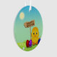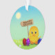 Ilustração de Páscoa bonita, com um pintinho segurando um cartaz de madeira com saudação de Felz pascoa, sentado num campo de flores ao lado de ovos coloridos de Páscoa.