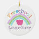 Este ornamento personalizado faz um grande presente para professores prées-escolar. A parte dianteira lê "o professor pré-escolar" com um arco-íris e uma maçã. A parte traseira pode ser personalizada com seus mensagem e nomes do feriado.