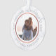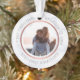 Este Enfeites de natal personalizado apresenta um design de ouro rosa moderno sobre fundo de mármore falso. Personalize os nomes, o ano e a foto. Este modelo funciona melhor com fotos de formato paisagem com o casal no centro.