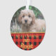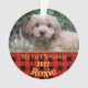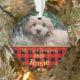 Uma decoração encantadora para a sua árvore de Natal, este ornamento apresenta seu filhote em um fundo vermelho e preto. Basta adicionar as fotos do seu filhote, o nome e o ano de nascimento para uma manutenção única.