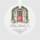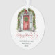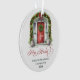 Primeiro Natal Elegante Monogrammed Novo ornamento Doméstico, Crie um belo e elegante presente para celebrar seu Natal de 1rua em sua nova casa. Aquarela com alegre porta vermelha e verde floral de férias para celebrar a época de Natal. Monograma com endereço e data. A tipografia Elegante Script diz New Home.