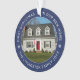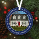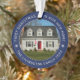 Personalize este enfeite moderno e elegante do "Primeiro Natal em Nossa Nova Casa" com uma foto da sua casa, do seu sobrenome ou da sua família, e do ano em que foi comprado. Azul-marinho elegante (a cor de fundo pode ser modificada) e o texto branco em forma redonda e os sotaques do floco de neve moldam lindamente a foto. Dica da foto: recorte a foto em um formato quadrado antes de carregar no site.