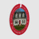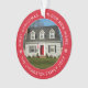 Personalize este enfeite moderno e elegante do "Primeiro Natal em Nossa Nova Casa" com uma foto da sua casa, do seu sobrenome ou da sua família, e do ano em que foi comprado. A cor vermelha de fundo Elegante pode ser modificada) e o texto branco em forma redonda e os acentos do floco de neve formam belamente a foto. Dica da foto: recorte a foto em um formato quadrado antes de carregar no site.