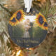 Foto de casamento de recém-casados russos Primeiro Natal como Sr. e Sra. personalizaram o ornamento de árvore com buquês de girassol de ouro amarelo sobre uma madeira castanha escura com luzes de cordas. ++++++++ Fácil de personalizar com seus nomes, texto e foto! +++++++++ Pode ser um presente de manutenção bonito para um novo casal.