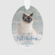 Comemore o primeiro Natal do seu animal de estimação em sua nova casa com este belo ornamento moderno do keepsasasasaame. As palavras "Primeiro Natal" aparecem num elegante roteiro azul. Substitua a imagem de exemplo por uma foto do seu gato ou cão e adicione seu nome e o ano em fonte azul sans serif. Um filtro de gradiente branco ajuda a fazer o pop de texto.
