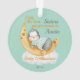 Celebre seu novo anúncio de bebê com esta adorável... só as melhores irmãs são promovidas para o ornamento da árvore da tia. . Mostrando um pinguim de desenho animado de bebê dormindo em uma crescente lua que está sentada em uma nuvem com um fundo verde-claro. Que bom dar como presente para anunciar sua gravidez. Por que não adicioná-lo a uma garrafa de vinho para uma celebração? Todo texto pode ser personalizado para atender às suas necessidades, como mãe para avó, amigo para madrinha ou qualquer outra pessoa. Então personalize adicionando o nome e o ano do bebê. A cor de fundo pode ser alterada, se necessário - basta clicar no botão personalizá-la. Oh e parabéns!