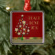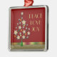 Um ornamento prateado da árvore de Natal com as palavras paz, amor, alegria. Vermelho e verde.