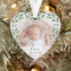 Este lindo ornamento de Natal para o primeiro Natal do seu bebê apresenta duas das suas fotos pessoais favoritas do seu bebê recém-nascido, com um lugar para adicionar o seu nome. A forma cardíaca é moldada por elegantes folhas verdes de aquarela, para um design botânico que será um tesouro.