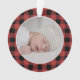 Photo ornament design for the holidays features a favorite image of your child with a farmhouse style red and black buffalo check plaid patterned background. Add your baby's name and year using the template. Perfect as keepsake for newly grandparents or parents