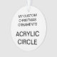 O costume imprimiu o modelo ACRÍLICO REDONDO personalizado do vazio da DECORAÇÃO do ORNAMENTO da ÁRVORE de NATAL do CÍRCULO - 3,46" altamente x 3,14" largamente x 0,187" densamente. O design, cria, faz seus próprios. Sua foto, imagem, texto, logotipo, gráficos no impressão de cor completa em ambos lado do ornamento, usando o processo de impressão de AcryliPrint®HD. Feito do acrílico ultra-durável.
