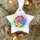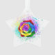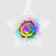 Rosa grande e florescente com pétalas arco-íris sobre fundo branco, pintadas com pedaços de tinta colorida e brilhante. 3d