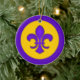 Uns enfeites de natal cerâmicos da flor de lis. Em ambos os lados, em um fundo do ouro, com um profundo - roxo e uma flor de lis roxa. Se você gosta, você pode adicionar o texto usando o botão da PERSONALIZAÇÃO abaixo da imagem. Personalize-a com um nome, uma data, um nome da equipe, ou o outro texto. Faz um grande presente de época natalícia, ou olha bonito em seus árvore de Natal ou pacotes do Natal.