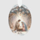 This serene nativity scene captures the peaceful beauty of the Holy Family beneath a rustic wooden stable, gently lit by lanterns and surrounded by soft snowfall. The design features Mary, Joseph, and baby Jesus in a warm, reverent moment, accentuated by delicate winter florals, snow-covered pine branches, and glowing string lights. Doves and woven baskets add a pastoral charm, while the overall soft watercolor style evokes a quiet, sacred atmosphere. Ideal for those seeking spiritual or religious Christmas decor, this artwork combines timeless symbolism with elegant seasonal touches, creating a touching and reflective holiday image. AI generated artwork.