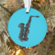 Design com ilustração do saxofone de pintura negra sobre fundo azul; elegante design de instrumentos musicais simples de jazz