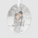 Comemore o seu noivado com este belo ornamento moderno do keepsasaame. O texto da cinza lê "Nosso primeiro Natal engajado", com a palavra "engajado" em uma escrita elegante com florescimento antes e depois. Substitua a imagem de exemplo por sua foto favorita e adicione seus nomes e o ano. Um filtro de gradiente branco ajuda a fazer o pop de texto.