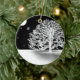 Um design preto e branco simples. Neve branca, árvore branca, flocos de neve brancos e uma lua branca contra um céu do escuro como breu.