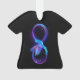 Símbolo luminoso, roxo e infinito com beija-flor azul voadora, luminosa, em fundo preto. Neon.