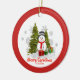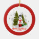 Este ornamento apresenta uma árvore de neve de inverno coberta de abetos e um bonitinho bonitinho bonitinho. A saudação inicial é "Feliz Natal" mais um espaço para um encontro. Há uma cartões de natal atrás que você pode personalizar com seu próprio texto. Um ornamento como este faria um presente pensativo para uma festa de troca de presentes de Natal ou um presente pensativo para aquele especial.