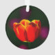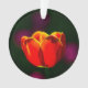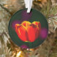 Flor de tulipa vermelha brilhante contra fundo verde escuro e manchas cor-de-rosa indefinidas de outras flores de tulipa. Almoço de fogo, esguicho de luz solar viva. O símbolo da nova vida. Brilhante, iluminado, irradiado e inspirador!